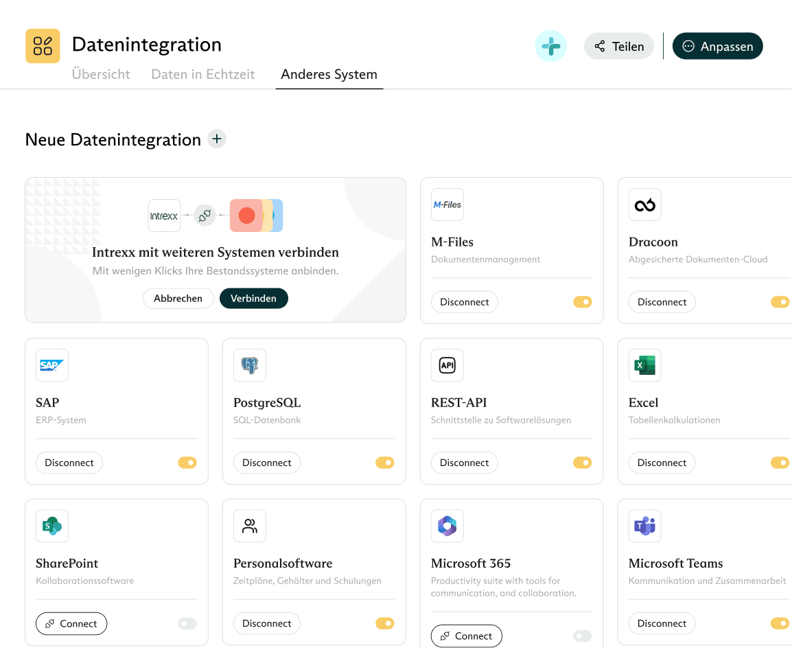 Für Verwaltungen mit spezifischen Anforderungen stehen umfangreiche Integrationsoptionen bereit. Die Intrexx Connector-API ermöglicht die flexible Anbindung spezialisierter Softwarelösungen und Legacy-Systemen durch benutzerdefinierte Schnittstellen.